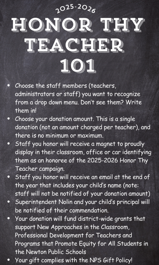 You can also donate by check made out to “Newton Schools Foundation” and mailed, along with a note containing your name, your student’s name, and the name and school of the teacher(s) or staff member(s) to be honored, to: Newton Schools Foundation, P.O. Box 590020, Newton, MA 02459